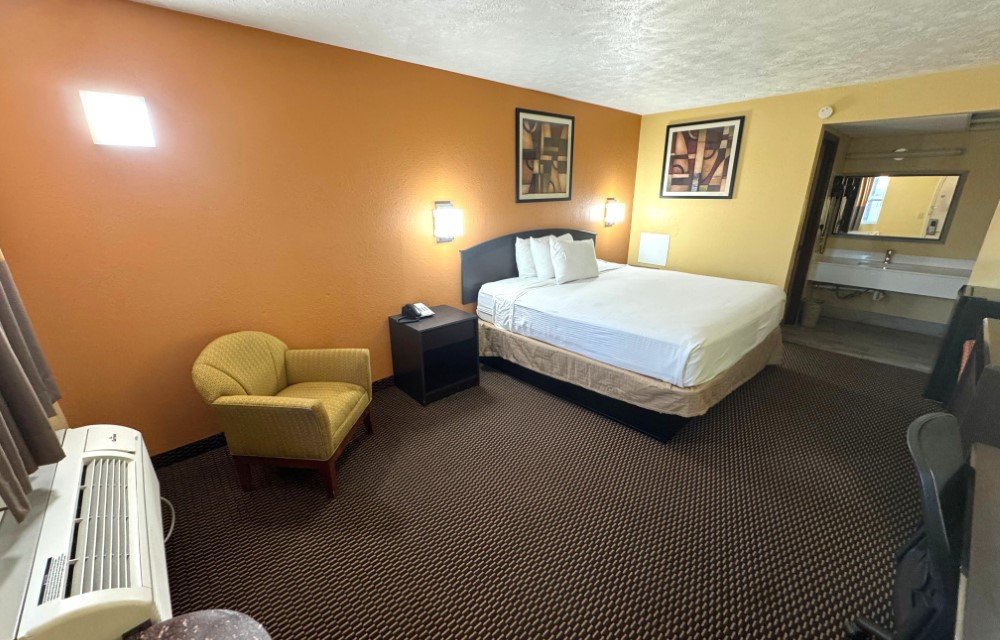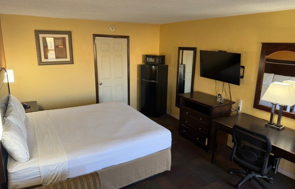 Designed for comfort and relaxation, the Standard King Non-Smoking Room features a plush king bed in a smoke-free environment. Guests can enjoy air conditioning, complimentary Wi-Fi, a flat-screen TV, and a work desk with chair. In-room conveniences include a refrigerator, microwave, and USB/USB-C charging ports, along with a private bathroom.